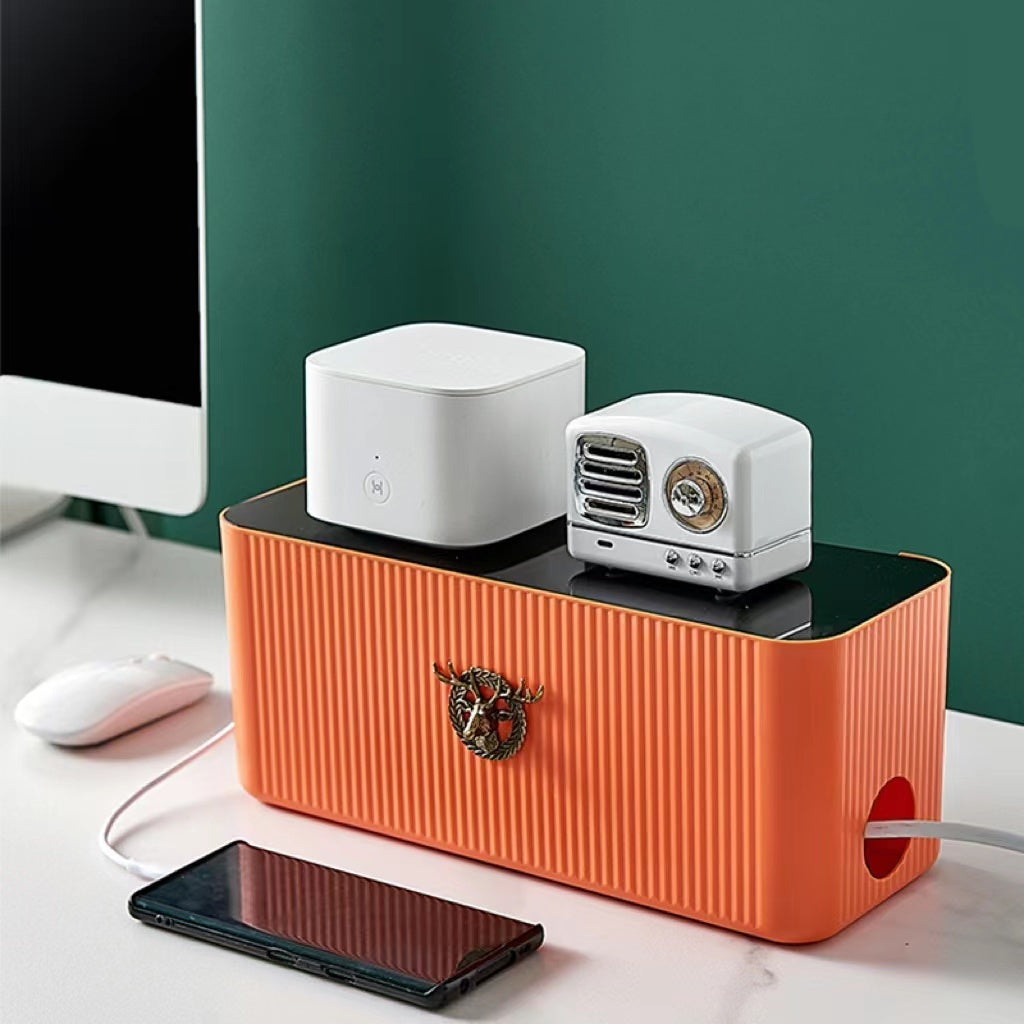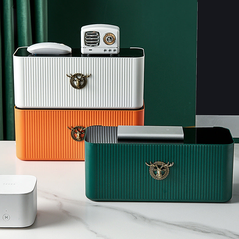 Stilfuld, let og luksuriøs opbevaringsboks designet til pænt at skjule og organisere kabler, opladere og småt tilbehør. Den er lavet af slidstærkt plastik med et stribet mønster og et monteret låg, så din arbejdsplads eller stue holder dig ryddelig og ryddelig.