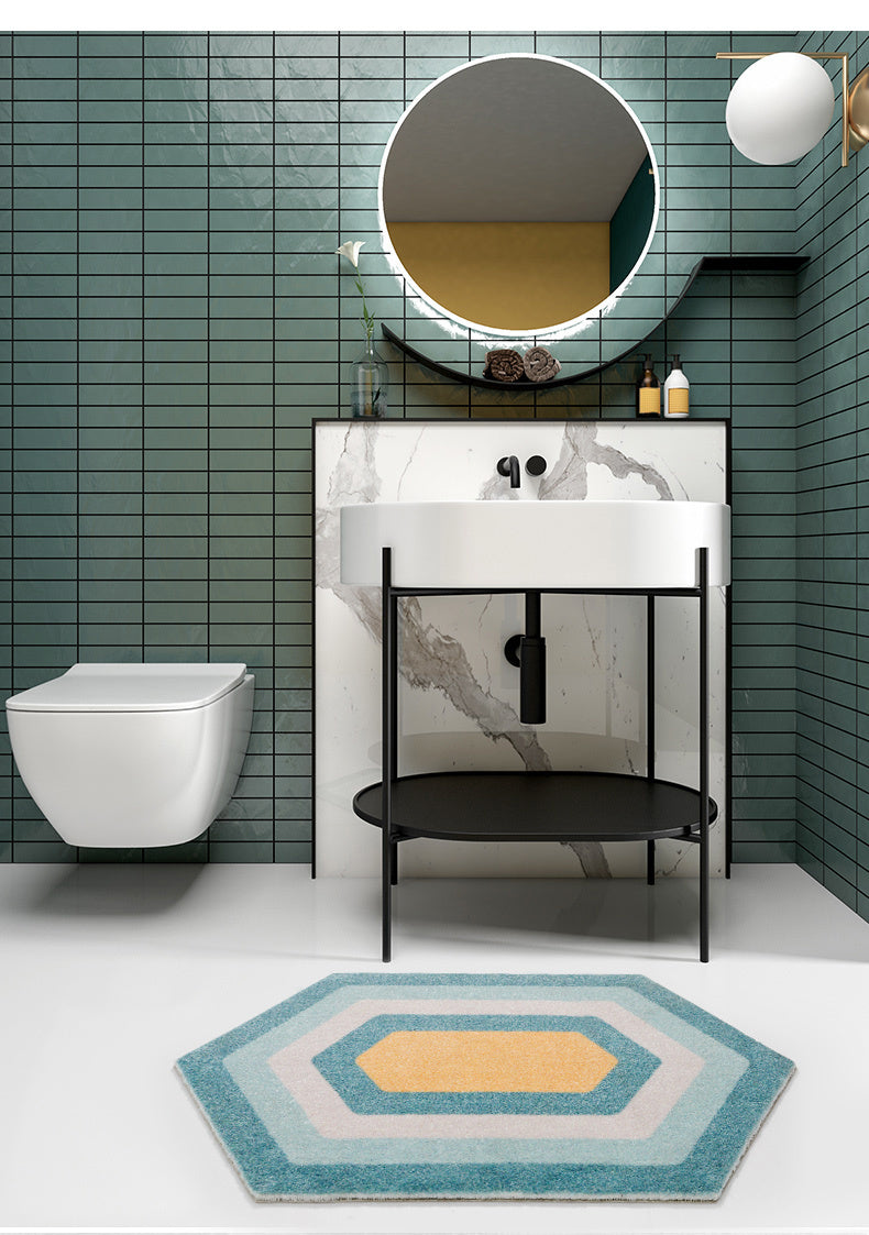 Moderne hurtigttørrende gulvmåtte med et stilfuldt geometrisk design, perfekt til daglig brug i hjemmet. Fremstillet af blød kemisk fiber, absorberer den fugt øjeblikkeligt og forhindrer samtidig glidning. Ideel til badeværelser, entréer eller ethvert andet opholdsrum.
