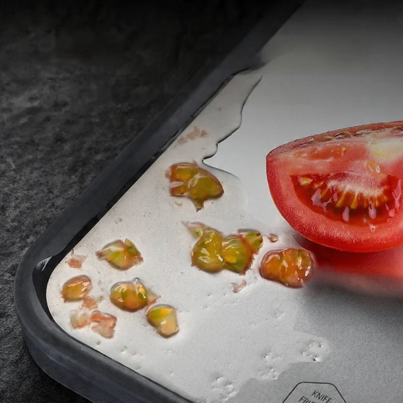 Et skærebræt med dobbelt overflade, rustfrit stål på den ene side og marmoreret PP på den anden. Hygiejnisk, skridsikkert og nemt at rengøre – perfekt til kød, fisk eller grøntsager. Leveres med en gratis knivsliber til daglig brug i køkkenet.